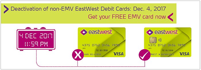 For our cardholders' protection, all non-EMV, magnetic stripe-only EastWest Debit Cards will be deactivated at 11:59 PM of December 4, 2017 and can no longer be used at ATMs, POS terminals, and online merchants from then on.