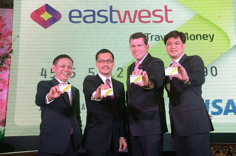 EastWest launches Southeast Asia’s first multi-currency prepaid card. (from left) EastWest president & CEO Antonio C. Moncupa, Jr., EastWest VP & Head of Bank Marketing and Corporate Communications Allan M. Tumbaga, Visa Country Manager for Philippines & Guam Iain Jamieson and EastWest EVP & Head of Retail Banking and Operations Cluster Gerry Susmerano flash the EastWest Travel Money, a prepaid card that can simultaneously accommodate six foreign currencies.