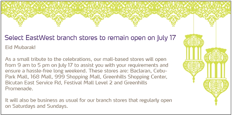 Holiday Advisory: Select EastWest stores will open on July 17, Eid'l Filtr