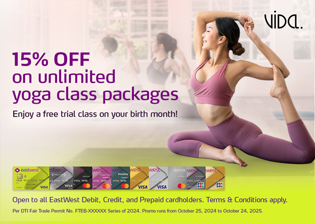 Get 15% discount on a Vida Yoga unlimited membership package and Free Trial class on your birth month with your EastWest Bank Credit, Debit, or Prepaid Card.